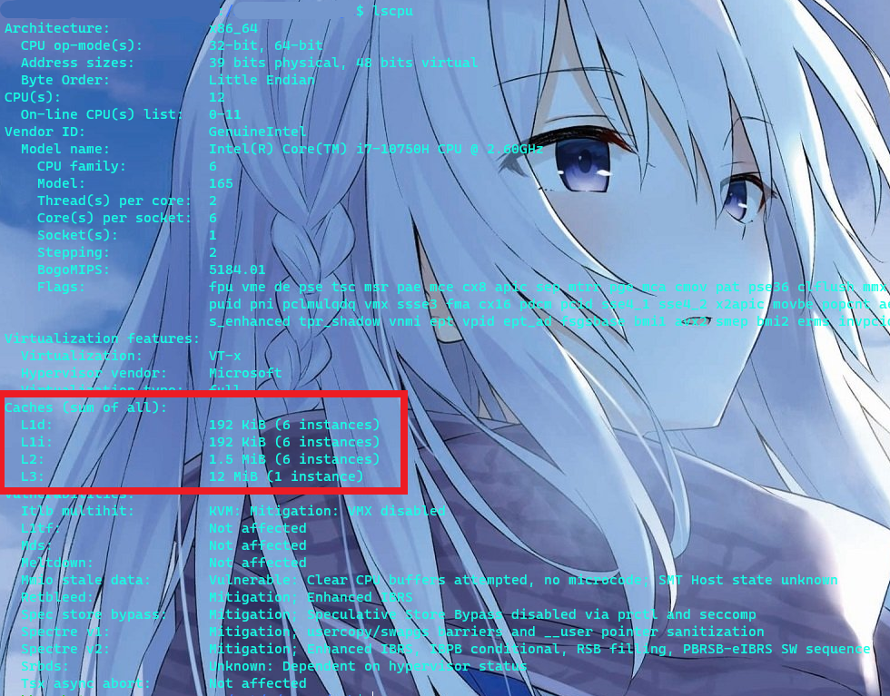 如图,这是一个 i7-10750H 的笔记本 CPU。该 CPU 一共有 6 个 独立的 L1 ICache 和 L1 DCache,总大小均为 192KB。同时,此 CPU 有 6 个独立的 L2 Cache,总大小为 1.5 MB。此 CPU 还有一个 L3 Cache 实例,容量为 12 MB。
