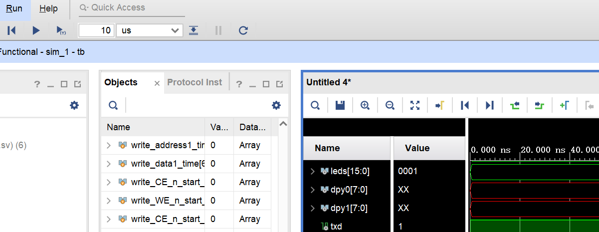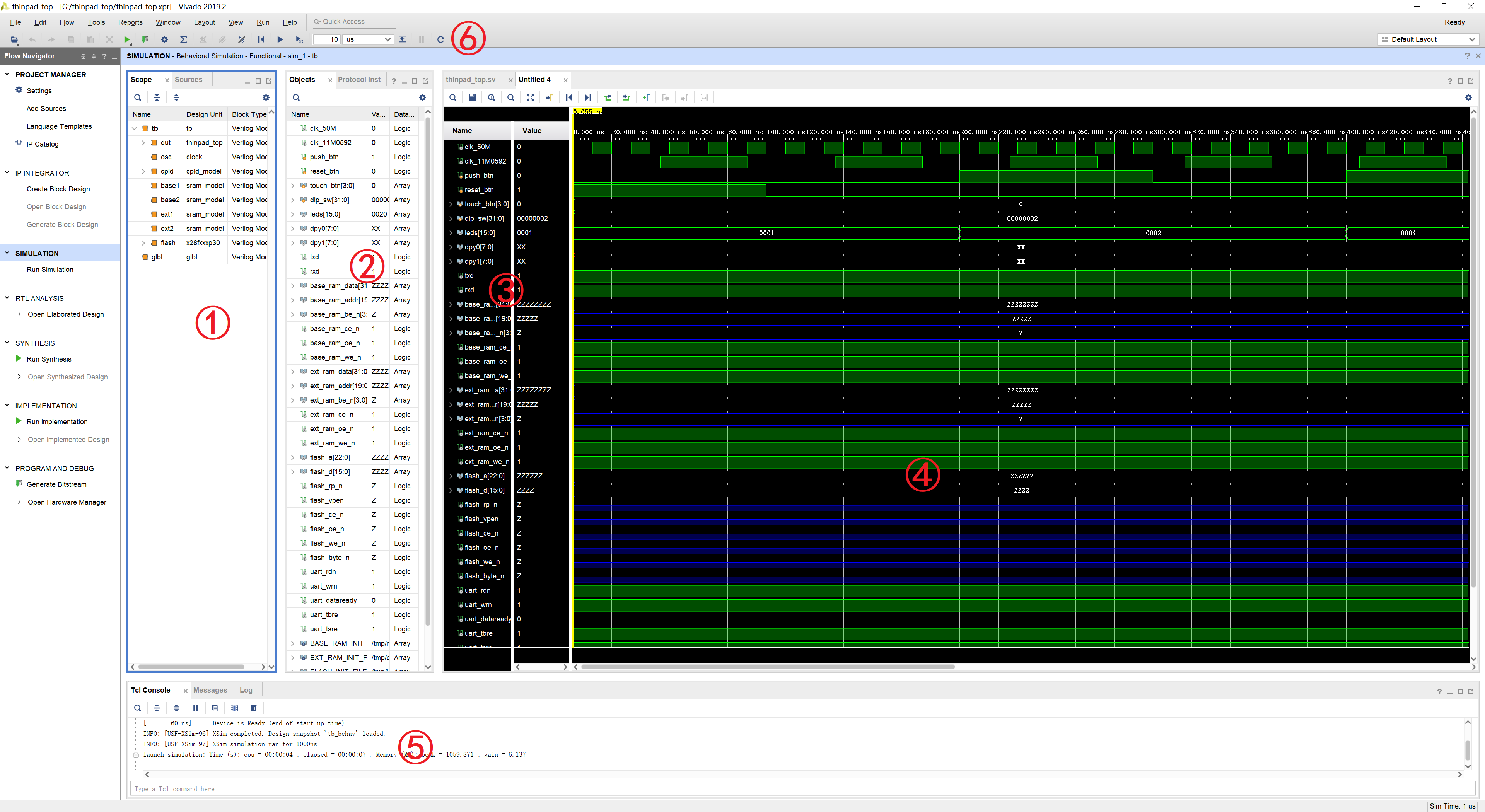 Vivado 具有非常丰富的仿真手段,包括行为仿真以及包含时延信息的综合后或者实现后仿真。行为仿真的计算量比较小,也是大家平时经常用的仿真流程。在这里就简单介绍一下行为仿真的使用方法。由于 testbench 已经由 thinpad_top 的顶层项目已经提供了,大部分情况下只需要修改 tb.sv 中的代码就可以对所设计的处理器进行仿真测试。