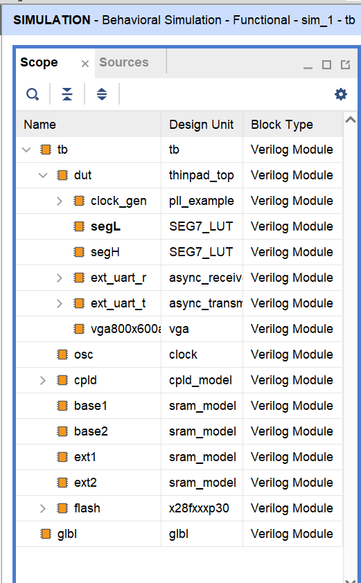 可以看到,dut(Design Under Test)就是待测的模块,就是 thinpad_top 的一个实例化。其它的是外围的仿真模型,包括串口,静态内存,FLASH 等。在顶层项目中,这些内容都已经被连接完成了,直接使用即可。